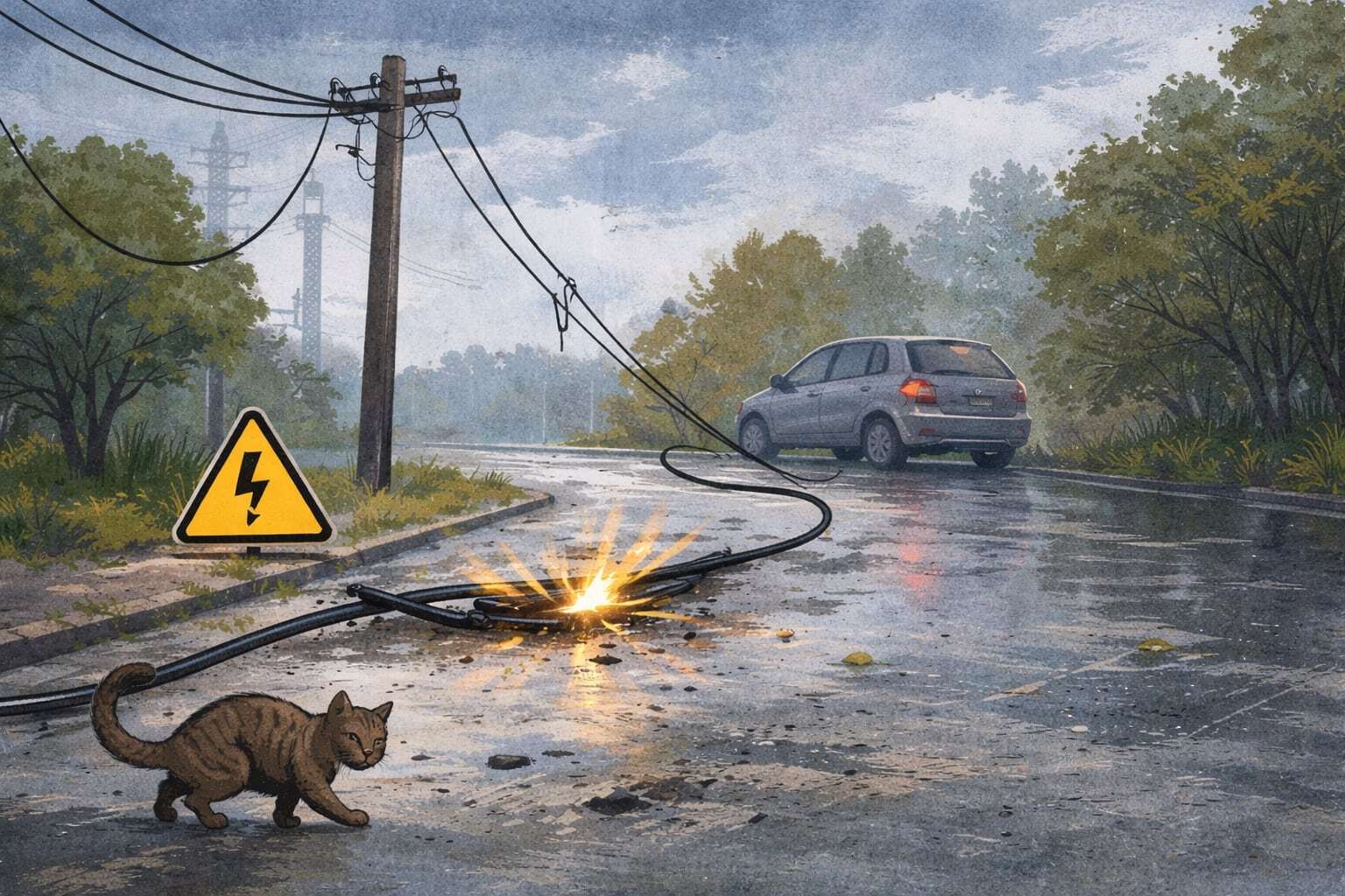 Зимой и в межсезонье (ветер, мокрый снег, наледь, падение веток) на улицах чаще появляются провисшие или оборванные провода. Самая опасная часть — то, что электричество можно не увидеть: провод может лежать в траве, в луже, касаться дерева/забора/машины, а зона риска вокруг — шире, чем кажется.